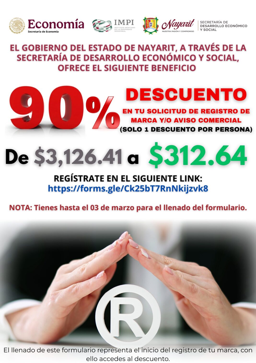 La Secretaría de Desarrollo Económico y Social pone a tu disposición el registro de tu marca y/o aviso comercial con el gran descuento del 90%, de $3,126.41 sólo pagarás $312.64.