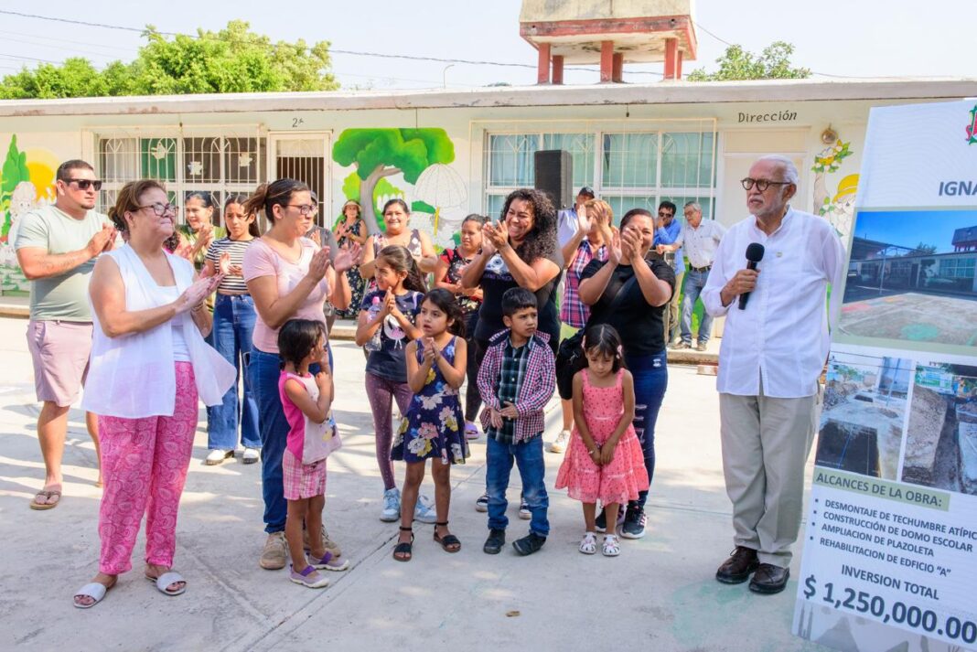 En este plantel se invierten 1 millón 250 mil pesos para desmontar la techumbre atípica, construir un domo escolar, ampliar la plazoleta y rehabilitar un edificio.