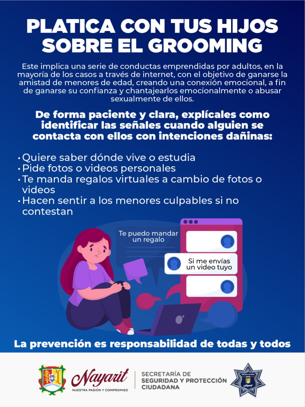 La Secretaría de Seguridad y Protección Ciudadana de Nayarit exhorta a madres, padres y tutores a mantenerse atentos al uso de internet por parte de niñas, niños y adolescentes, para prevenir el delito conocido como grooming.